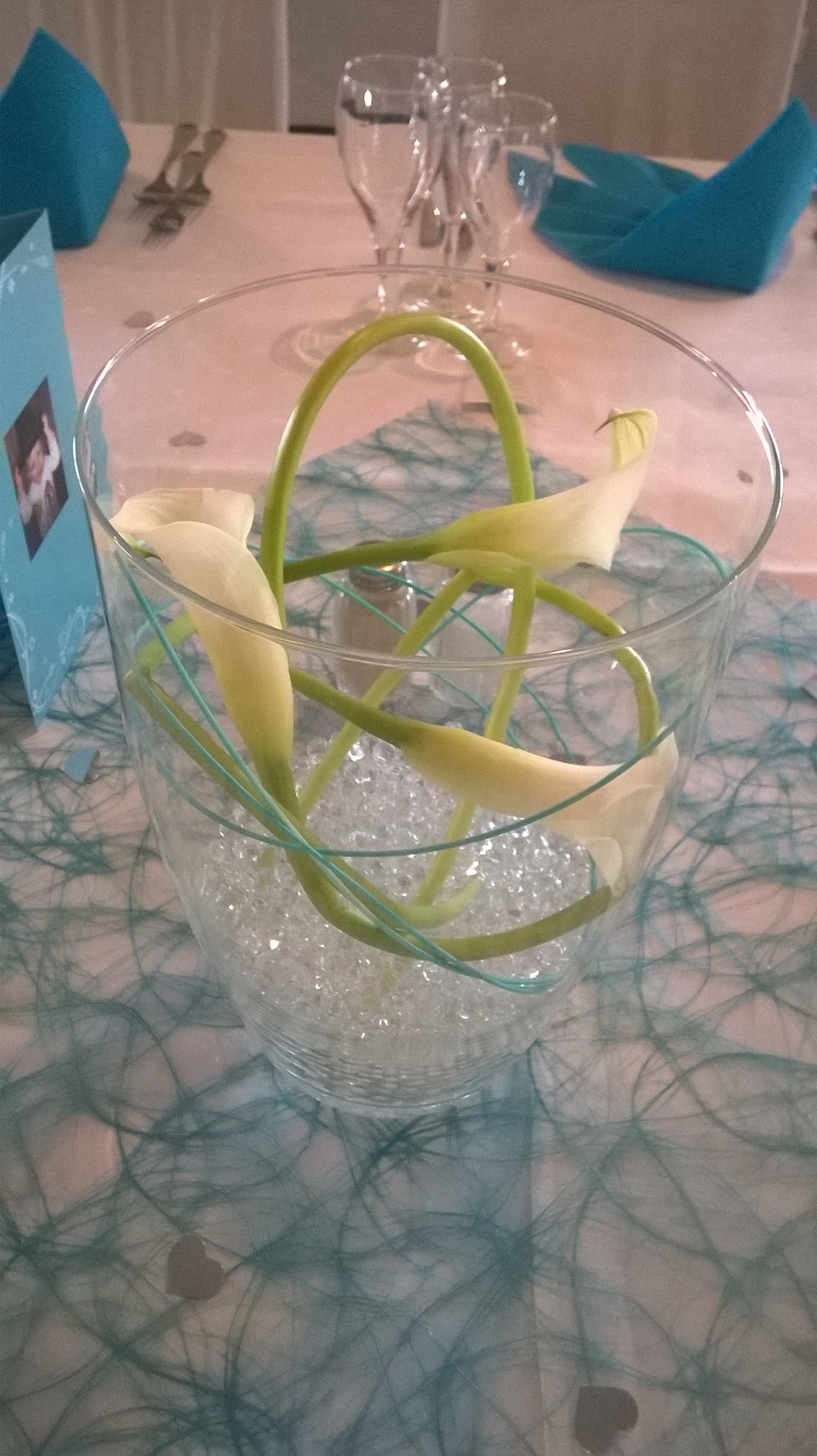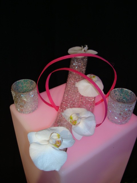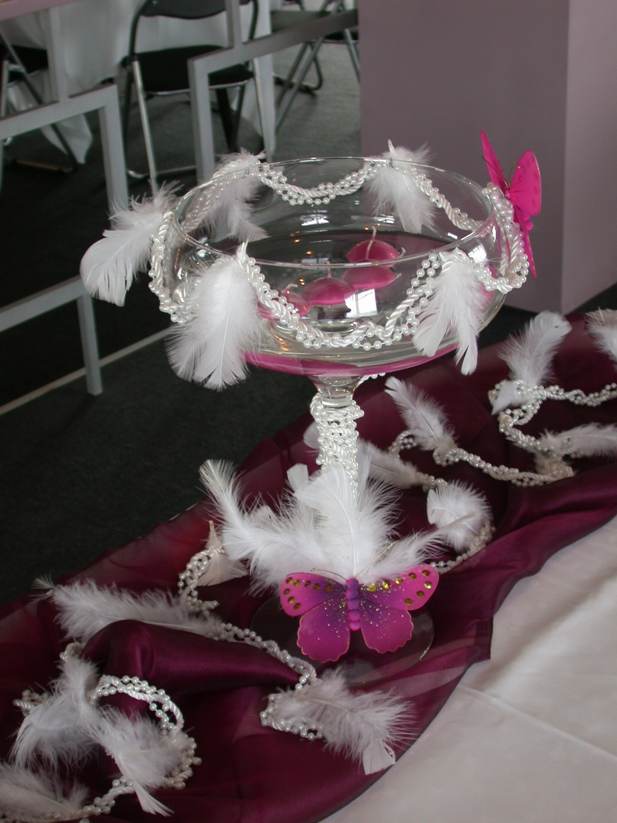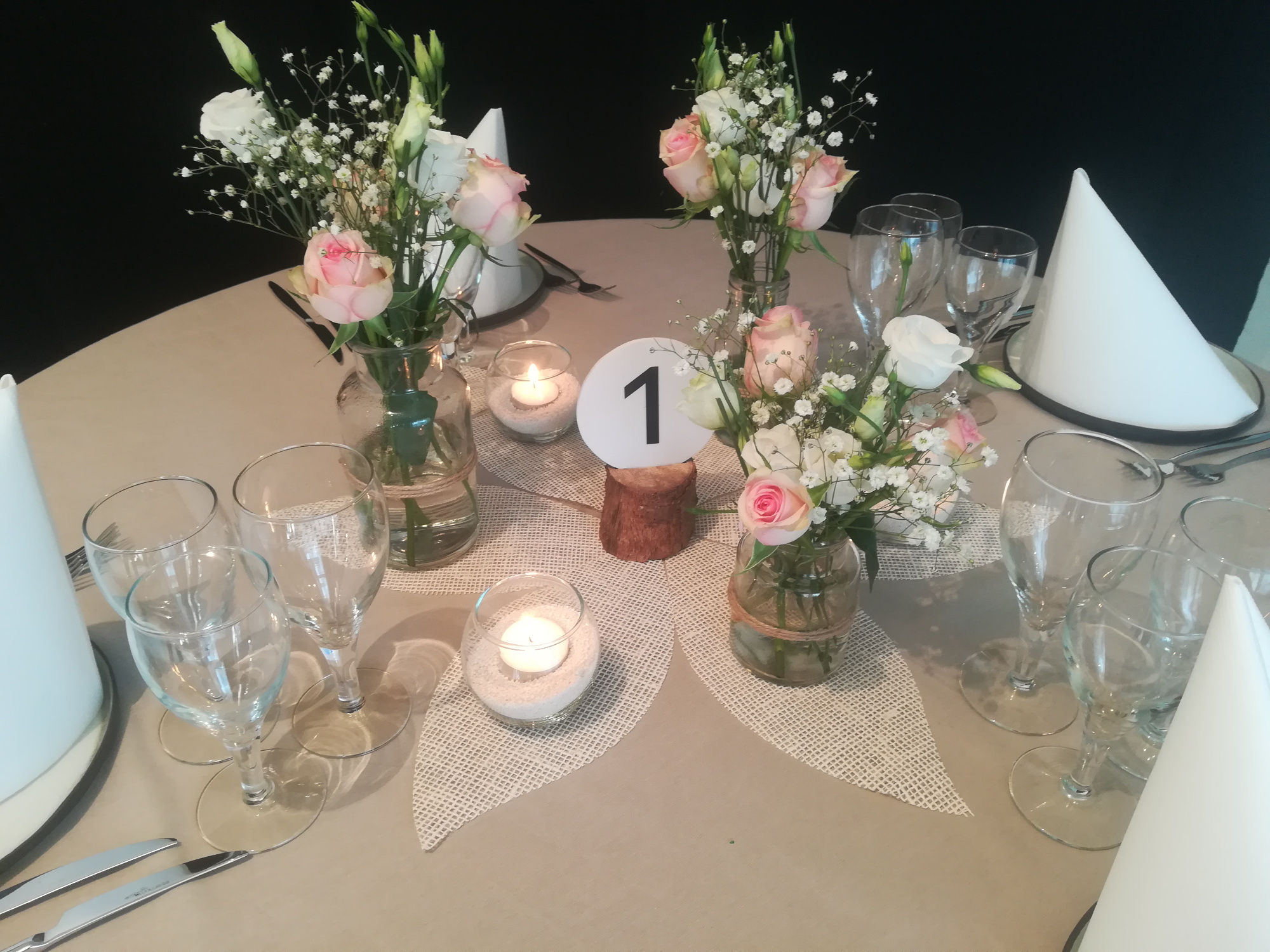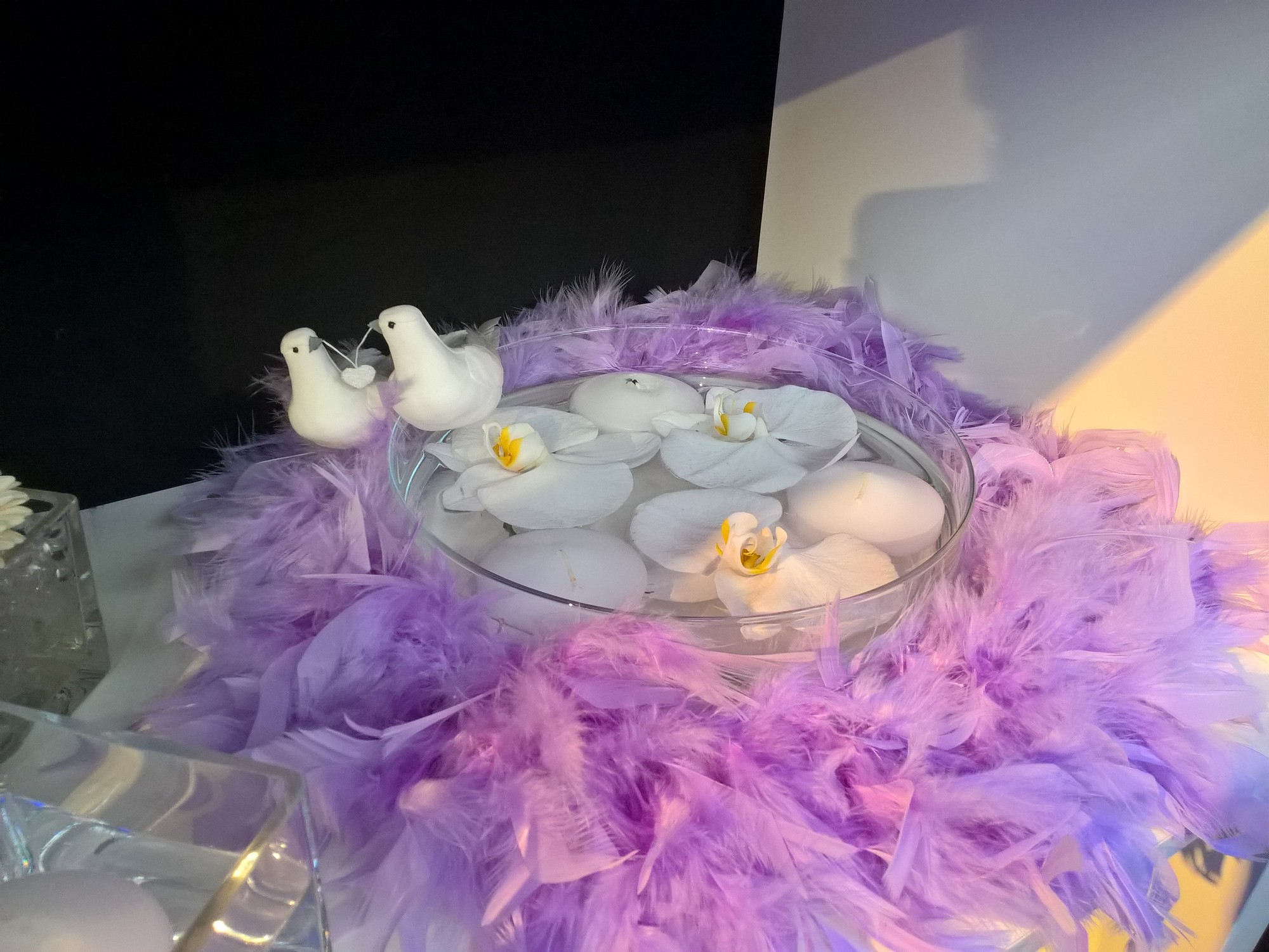 Sur commande, nous fournissons les fleurs, les bougies, sables, paillettes, plumes, chemin de table et autres consommables.