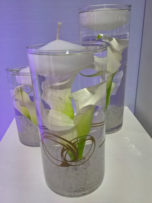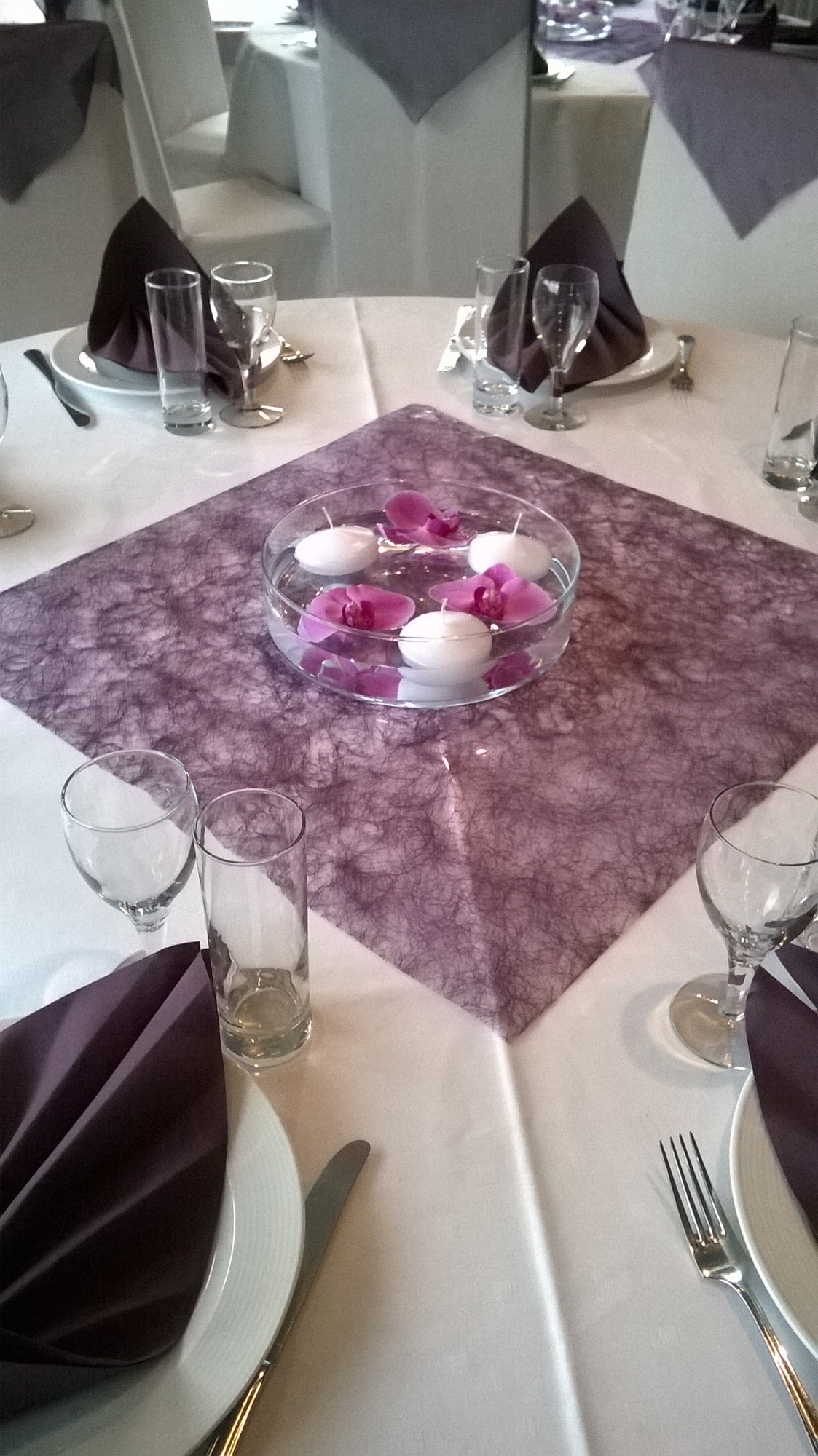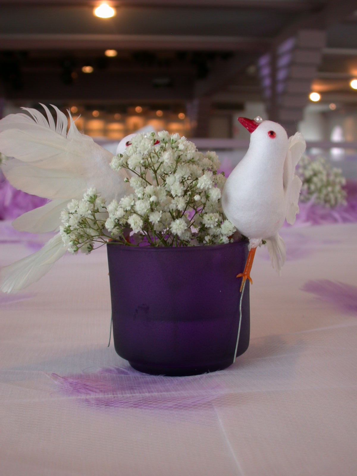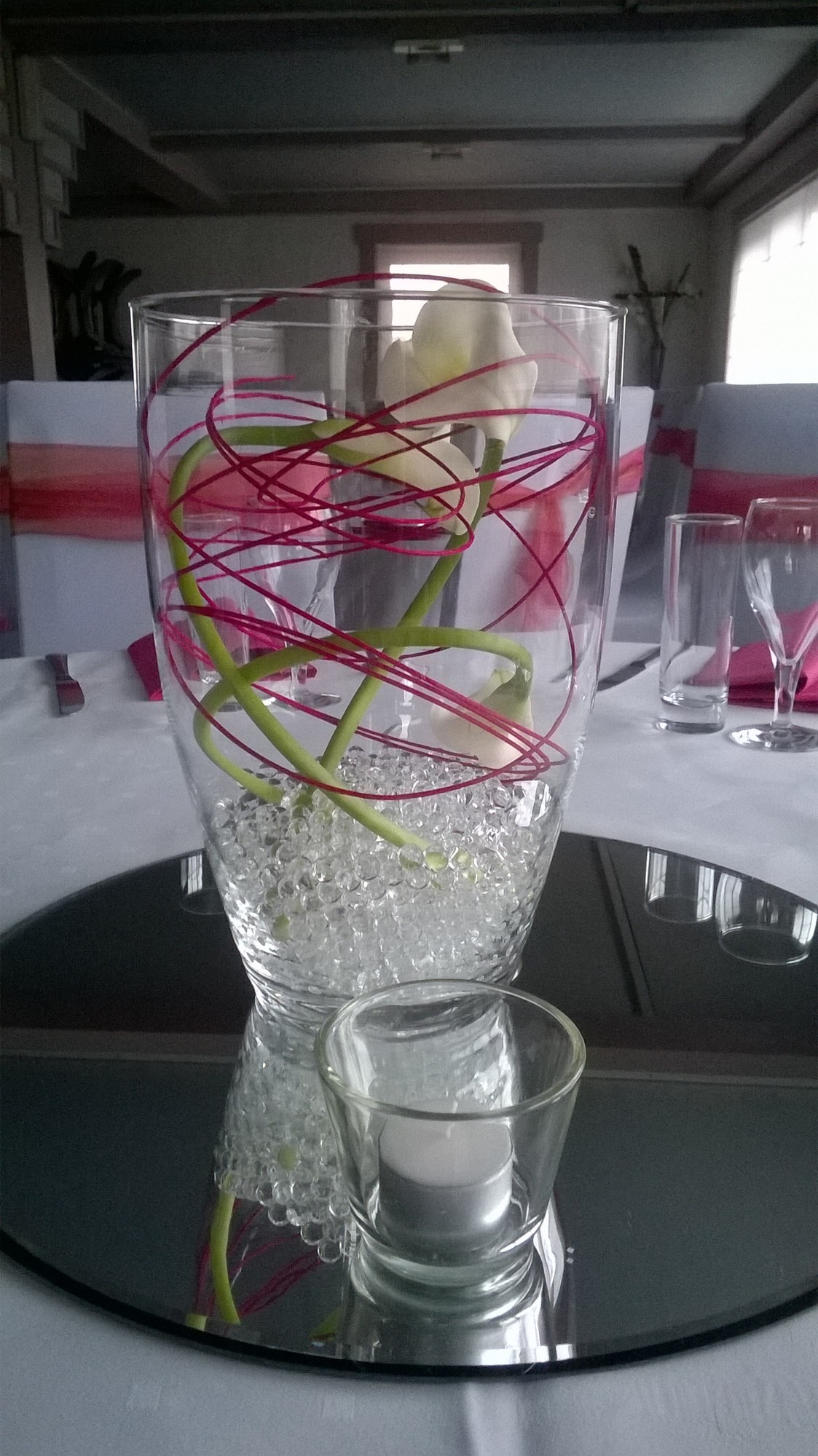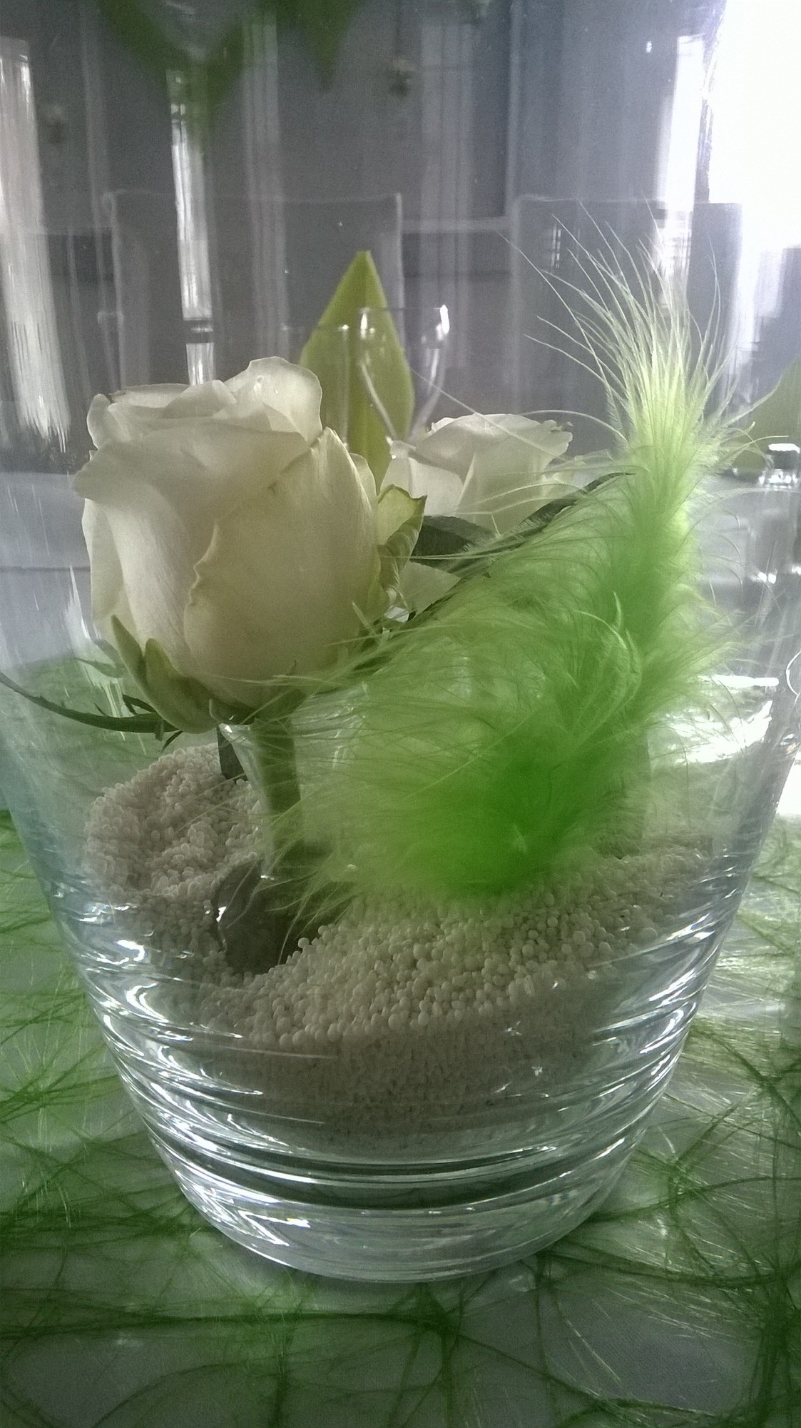 Sur commande, nous fournissons les fleurs, les bougies, sables, paillettes, plumes, chemin de table et autres consommables.