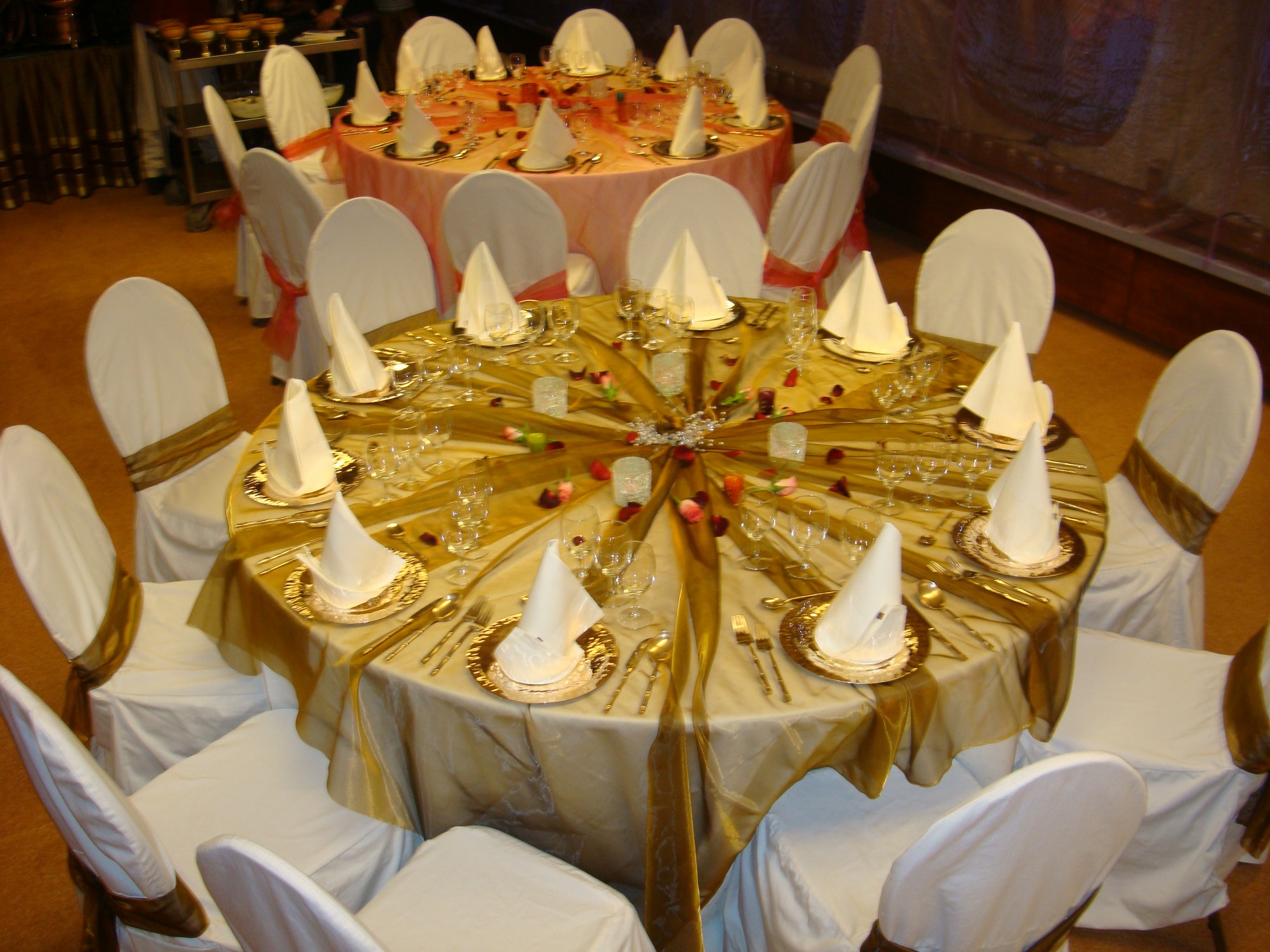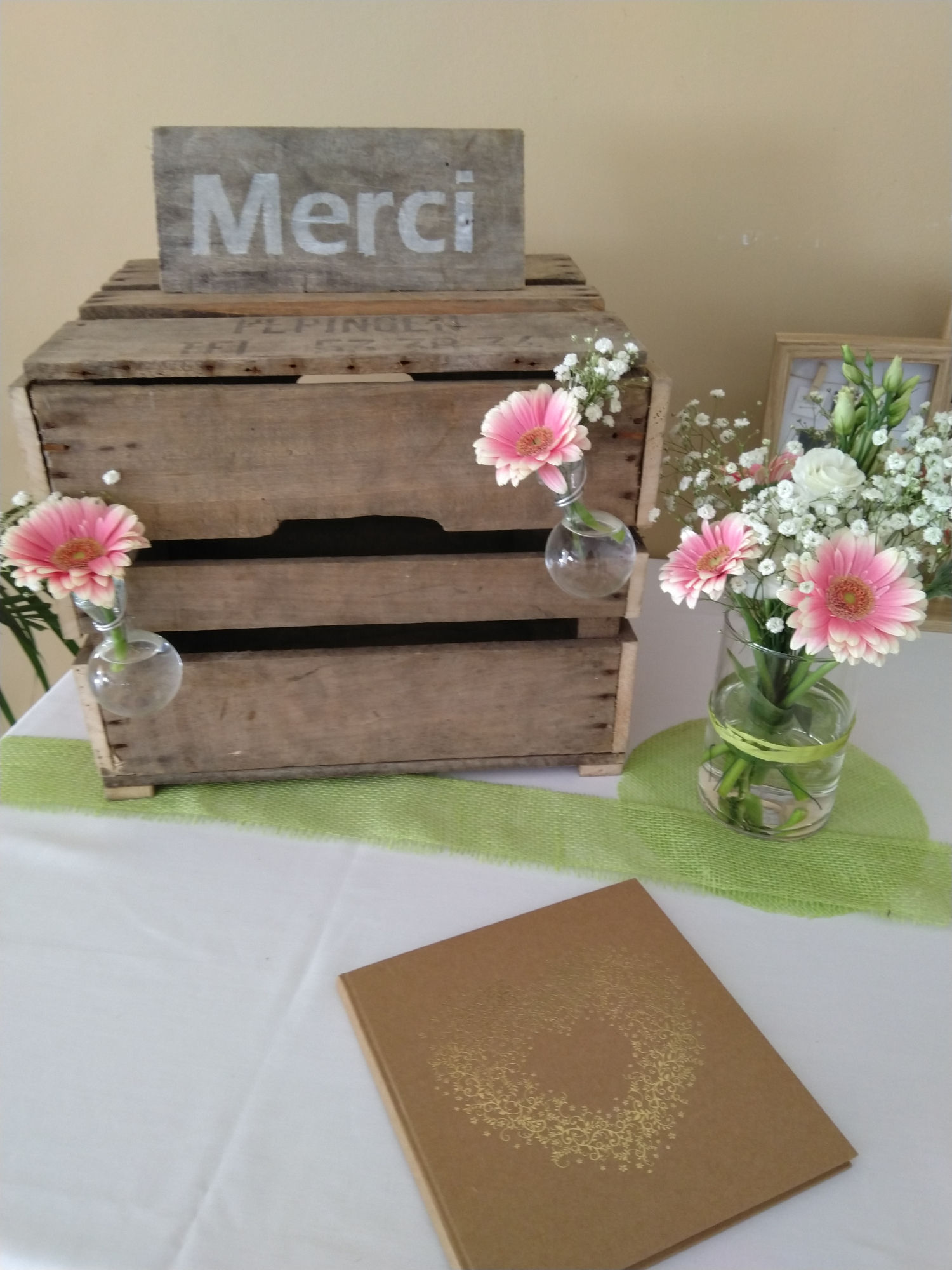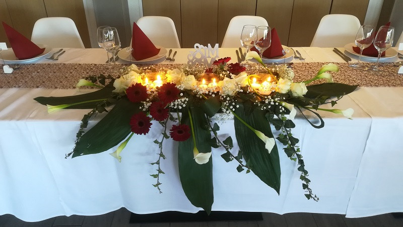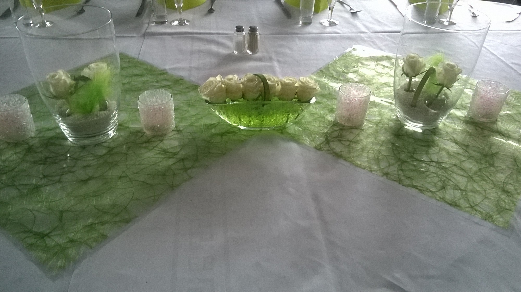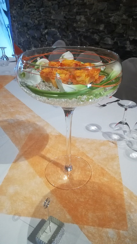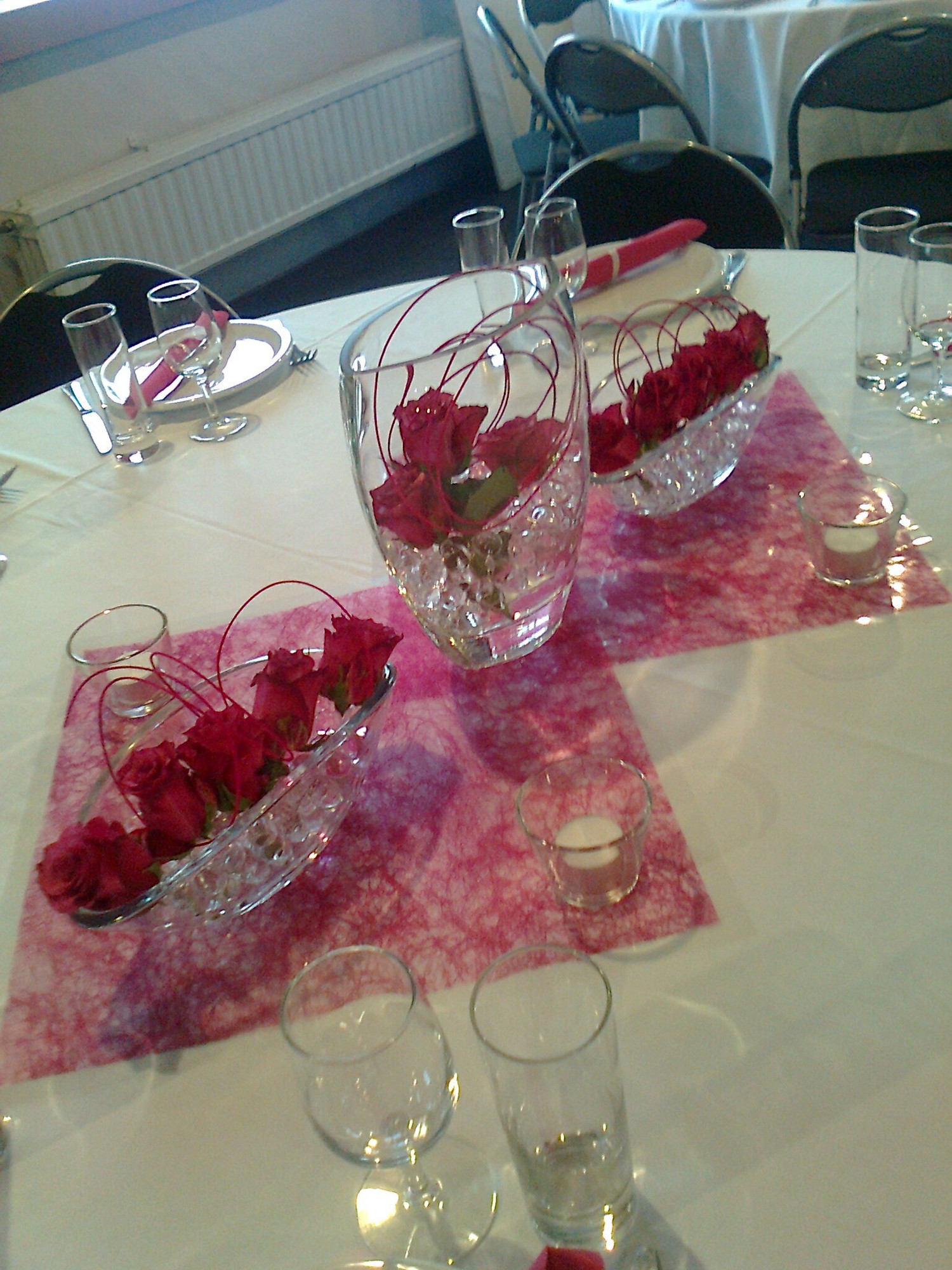 Sur commande, nous fournissons les fleurs, les bougies, sables, paillettes, plumes, chemin de table et autres consommables.